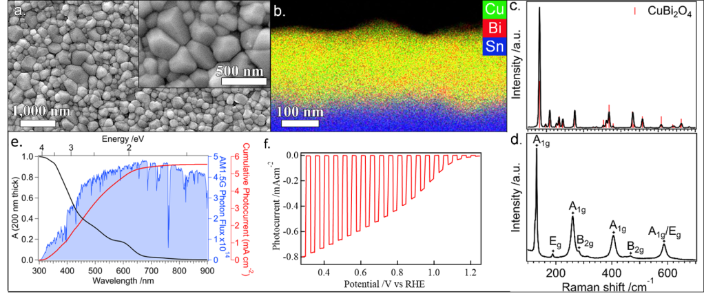 Artificial photosynthesis, which converts carbon dioxide and water to valuable chemical fuels by storage of solar energy in chemical bonds, is an approach to respond the growing global energy demand while combating climate change. Photocathodes made from p-type semiconductors supply photogenerated electrons and catalytically active sites. An ideal p-type material should meet the requirements of: ideal bandgap, correctly aligned band energetics, good photovoltage, and excellent stability. The search for promising new materials has uncovered cooper-based ternary oxides as potential candidates. Among these materials, CuBi2O4, has been demonstrated with a low bandgap, suitable conduction band minimum, good stability, and a large photovoltage around 1 V. However, the practical performance is only several percent of the theoretical maximum. The path to realizing efficiency improvements begins with a fundamental understanding of the electronic structure and optical properties. Herein, we investigate the optoelectronic properties of p-type copper bismuth oxide through the synergy of DFT modeling and a variety of experimental characterization methods including for example: x-ray spectroscopy, time-resolved optical spectroscopy, photothermal deflection spectroscopy, and ellipsometry. In this talk, we will discuss the orbital character of the valance and conduction bands, the related electronic transitions making up the optical absorption, photocarrier dynamics, defects both in bulk and surface, and the limited diffusion length. The unification of the variety of characterization techniques provides a complete view of the material optoelectronic structure enabling a deeper understanding of its emergent properties. Informed by the electronic structure, we will discuss opportunities to improve performance limitations by structural modification.