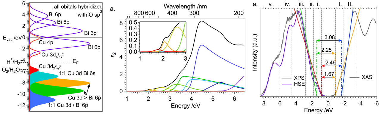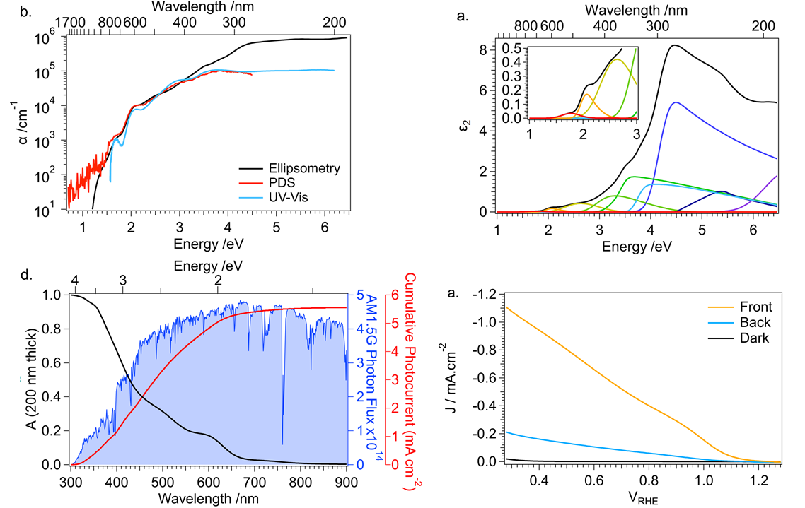 The economies of the future and the sustainability of the planet’s ecosystems will rely on green energy technologies such as through the capture of sunlight to drive chemical transformations. In particular, light-harvesting photoelectrodes dictate the generation of photovoltage and photocurrent so understanding the underlying physics governing performance and stability limitations are critical to advance related technologies. Specifically, CuBi2O4 is a natively p-type semiconductor with 1.5 – 1.8 eV optical bandgap; as a photocathode it has been demonstrated to have a photocurrent onset potential greater than 1 VRHE yet remains limited to about 1.5 mA cm-2. In this investigation we characterize the electronic structure (valence and conduction band orbital composition) of the material using a suite of advances spectroscopic techniques in conjunction with DFT modeling. These results suggest the limited electron polaron diffusion length of 45 nm is related to charge localization at Cu 3d states in the conduction band. Photoelectrodes made of plasmonic nanostructures are interesting for energy conversion applications due their dual function acting both as catalytic centers and light absorbers thus localizing the light energy directly at the catalytic site. Hollow-gold nanospheres (HGNs), thin shells of gold which can be readily dispersed in water, have a plasmon resonance absorption which can be tuned from 520 nm to the near infrared based on the shell dimeter and thickness making them excellent structures to harvest a large portion of the terrestrial solar flux. After the plasmon is excited, the energy is rapidly converted to heat the particle. In this study, through a combination of transient absorption (TA) spectroscopy and full scale molecular dynamics (MD) on 30 nm particles surrounded by water, the spatiotemporal temperature and pressure profiles reveal that photoexcitation of the HGN creates a high temperature and high-pressure environment particularly suited for thermal catalysis. These studies taken together identify an unique opportunity for coupled reaction micro-environments to take advantage of photoelectrochemical and photothermal reaction mechanisms.