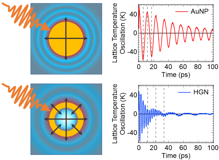 We offer a detailed investigation of the photophysical properties of plasmonic solid and hollow gold nanospheres suspended in water by combining ultrafast transient absorption (TA) spectroscopy with molecular dynamics (MD) simulations. TA reveals that hollow gold nanospheres (HGNs) exhibit faster excited state relaxation and larger amplitude acoustic phonon modes than solid gold nanoparticles of the same outer diameter. MD simulation carried out on full scale nanoparticle–water models (over 10 million atoms) to simulate the temporal evolution (0–100 ps) of the thermally excited particles (1000 or 1250 K) provides atomic-scale resolution of the spatiotemporal temperature and pressure maps, as well as visualization of the lattice vibrational modes. For the 1000 K HGN, temperatures upward of 500 K in the vicinity of the shell surface were observed, along with pressures up to several hundred MPa in the inner cavity, revealing potential use as a photoinduced nanoreactor. Our approach of combining TA and MD provides a path to better understanding how thermal–structural properties (such as expansion and contraction) and thermal–optical properties (such as modulated dielectrics) manifest themselves as TA signatures. The detailed picture of heat transfer at interfaces should help guide nanoparticle design for a wide range of applications that rely on photothermal conversion, including photothermal coupling agents for nanoparticle-mediated photothermal therapy and photocatalysts for light-driven chemical reactions.